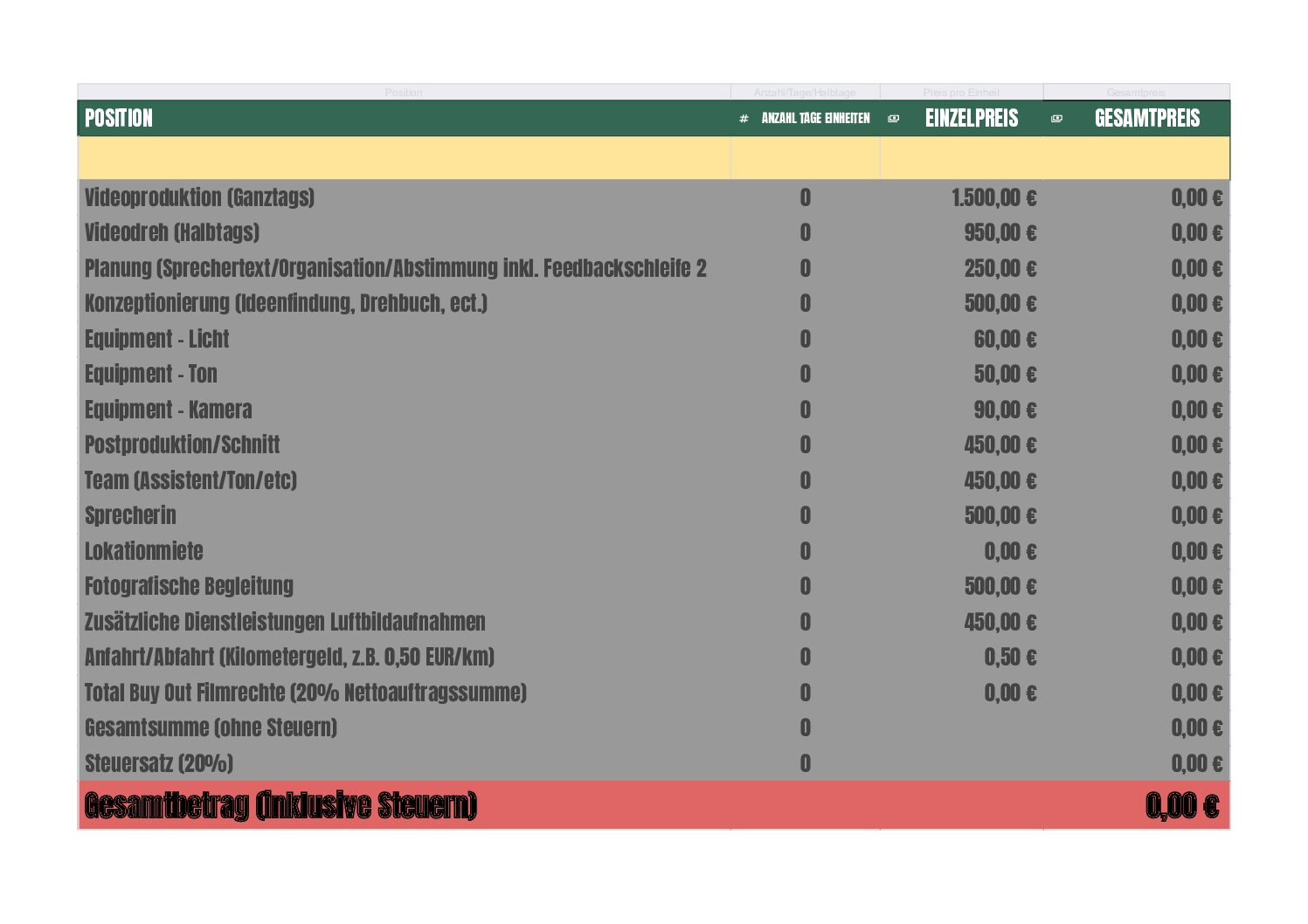 Dieser Posten umfasst die Kameratechnik inklusive Objektiven (RAW in 6K). Bei diversen Projekten werden besondere Kameras angefragt. Die Preise hierfür werden gesondert bei Angebotslegung erwähnt.
